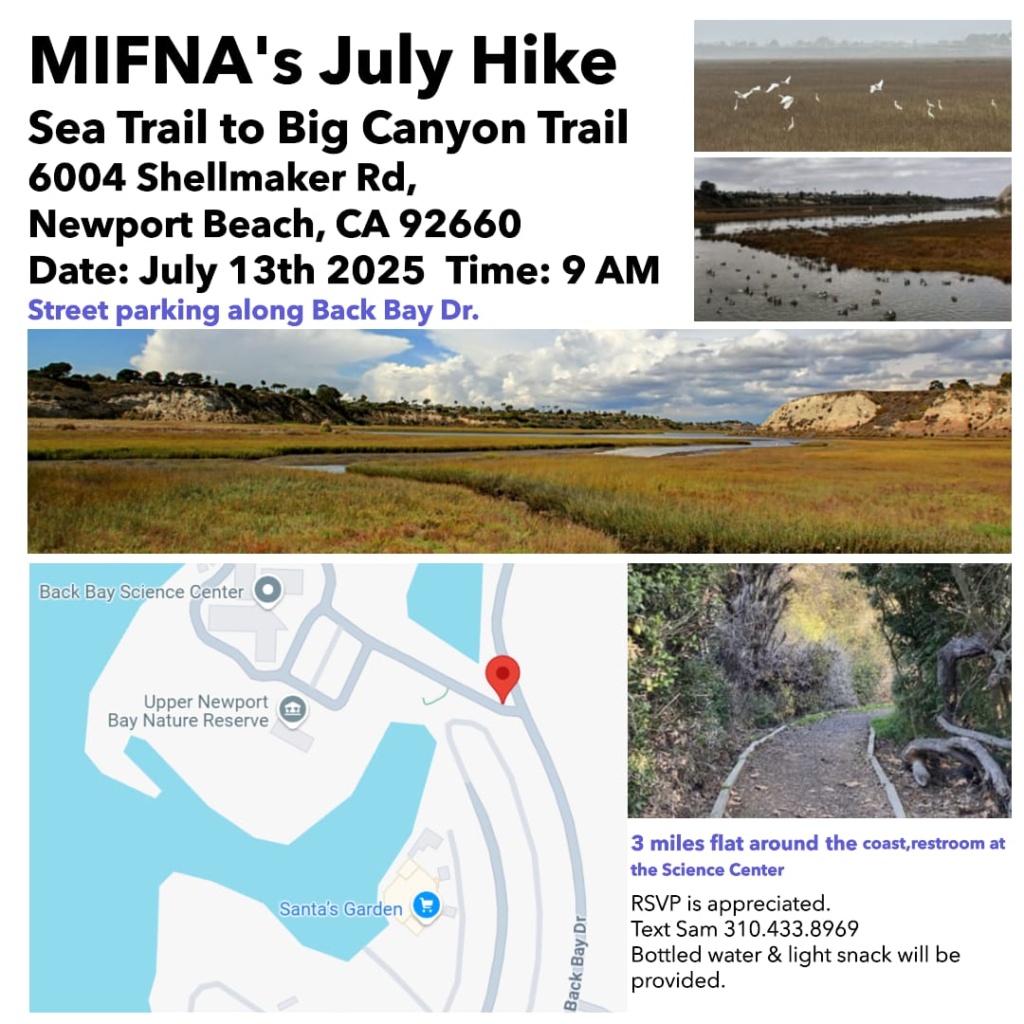 Our MIFNA hike/nature walk for July 2025 will be this Sun, July 13th, 2025, at the Sea Trail to Big Canyon Trail, 6004 Shellmaker Rd., Newport Beach, CA 92660.