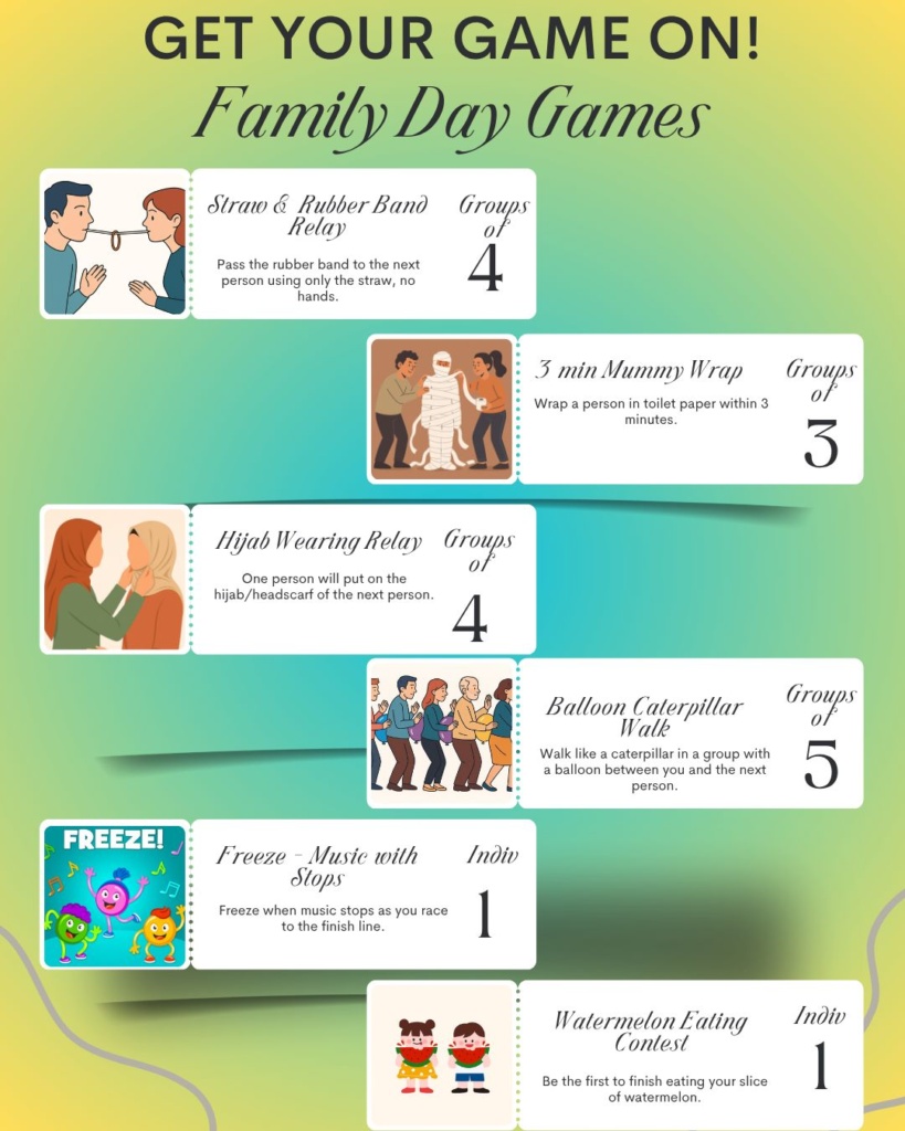 So, gather your teams/groups together, or participate as an individual. Just be sure to sign up at the registration table on the day of the event. Games will start at 1 pm after lunch and Zuhur prayers.