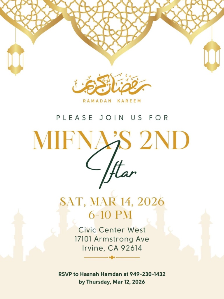 Please RSVP to Hasnah Hamdan at 949-230-1432 with the number of adults and kids (<12 yrs) in your party. The RSVP deadline is Thursday, March 12, 2026.