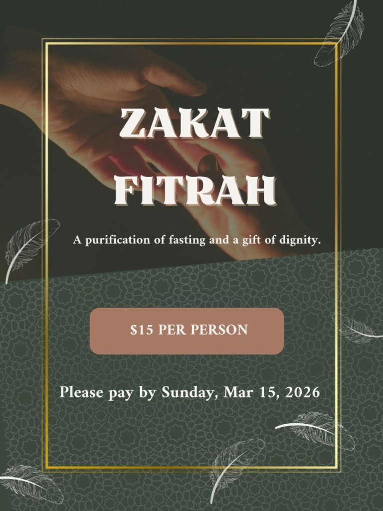 Please pay your zakat fitrah by Sunday, March 15, if possible, so as to enable the zakat committee to distribute the collection to qualified recipients before Eid il Fitri on March 20, 2026.