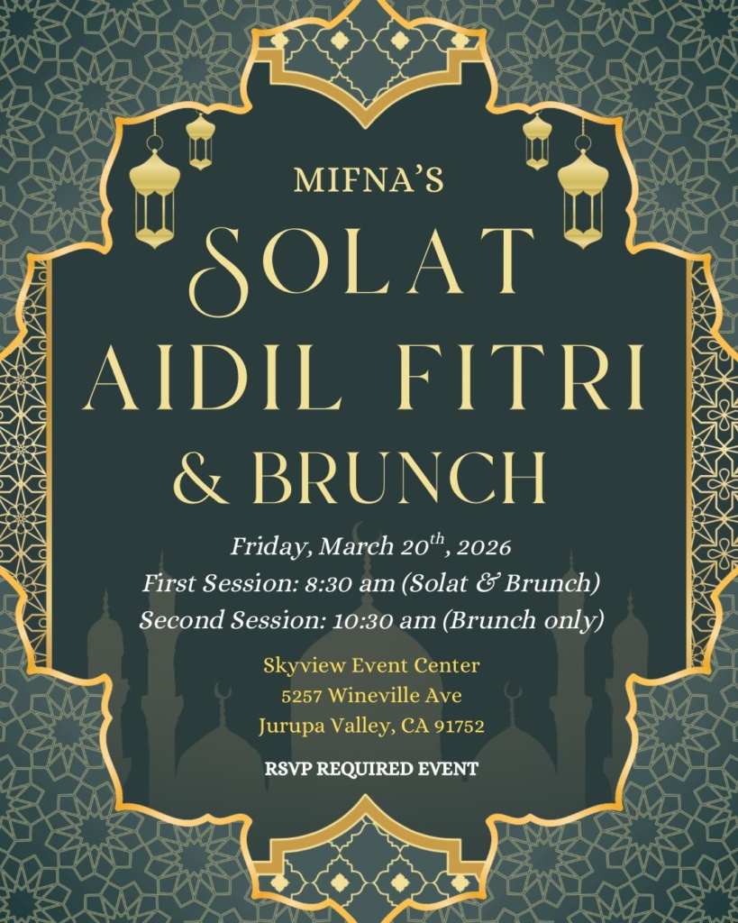 MIFNA will be hosting Solat ‘Aidil Fitri followed by brunch on Friday, March 20th at Skyview Event Center, 5257 Wineville Ave, Jurupa Valley, CA 91752.